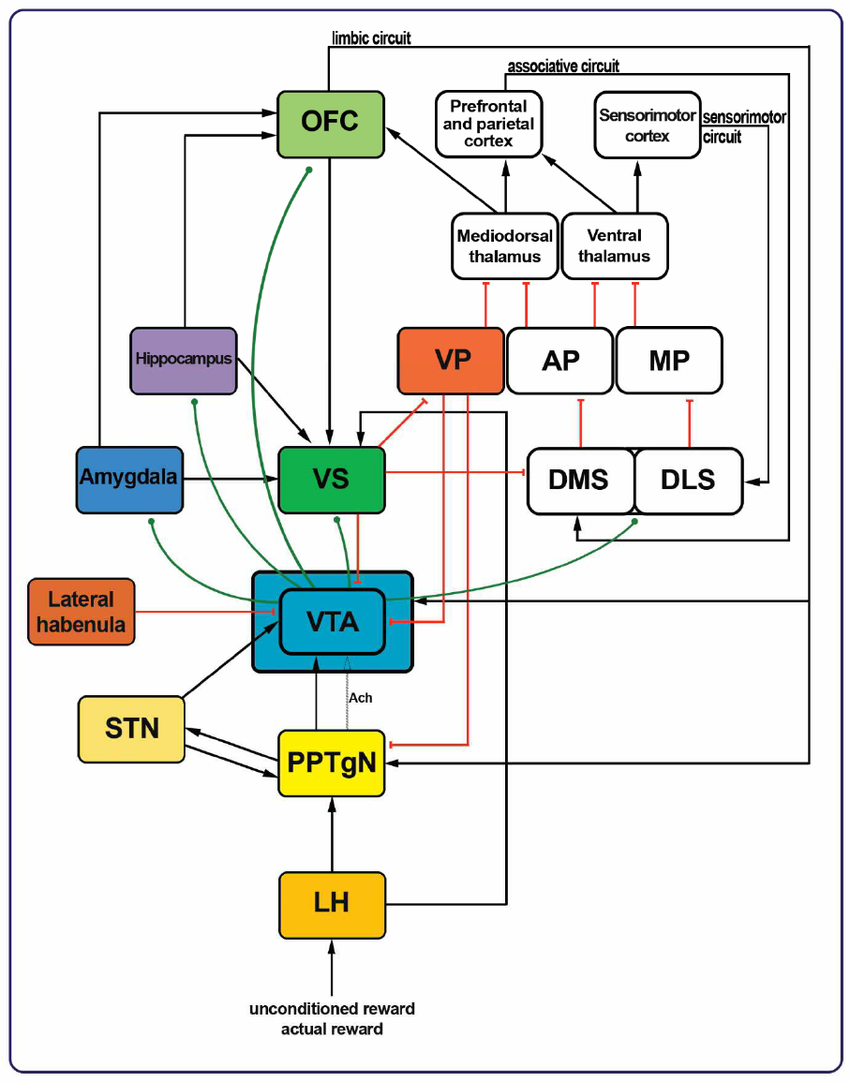 The limbic loop through the ventral striatum is involved in learning the motivational value of outcomes and their predictors.