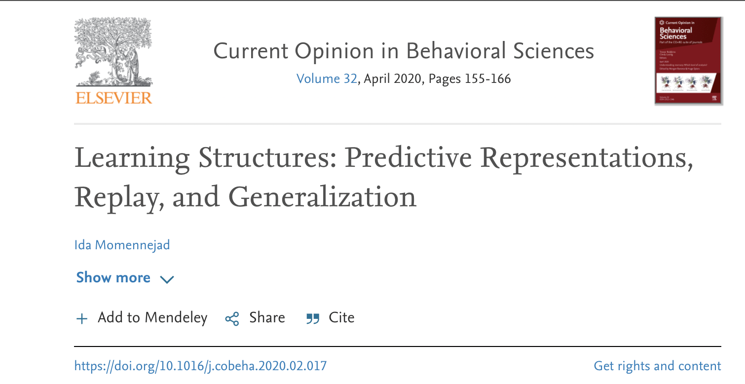 Momennejad, I. (2020). Learning Structures: Predictive Representations, Replay, and Generalization. Current Opinion in Behavioral Sciences 32, 155–166. doi:10.1016/j.cobeha.2020.02.017.