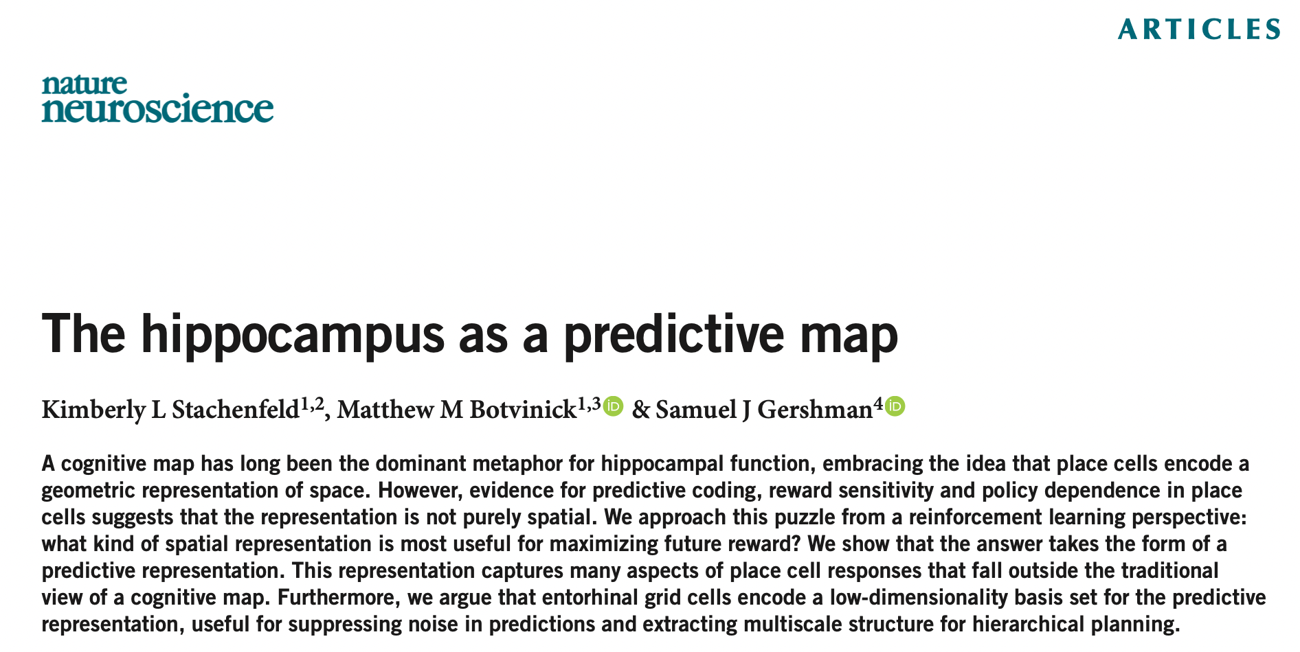 Stachenfeld, K. L., Botvinick, M. M., and Gershman, S. J. (2017). The hippocampus as a predictive map. Nature Neuroscience 20, 1643–1653. doi:10.1038/nn.4650