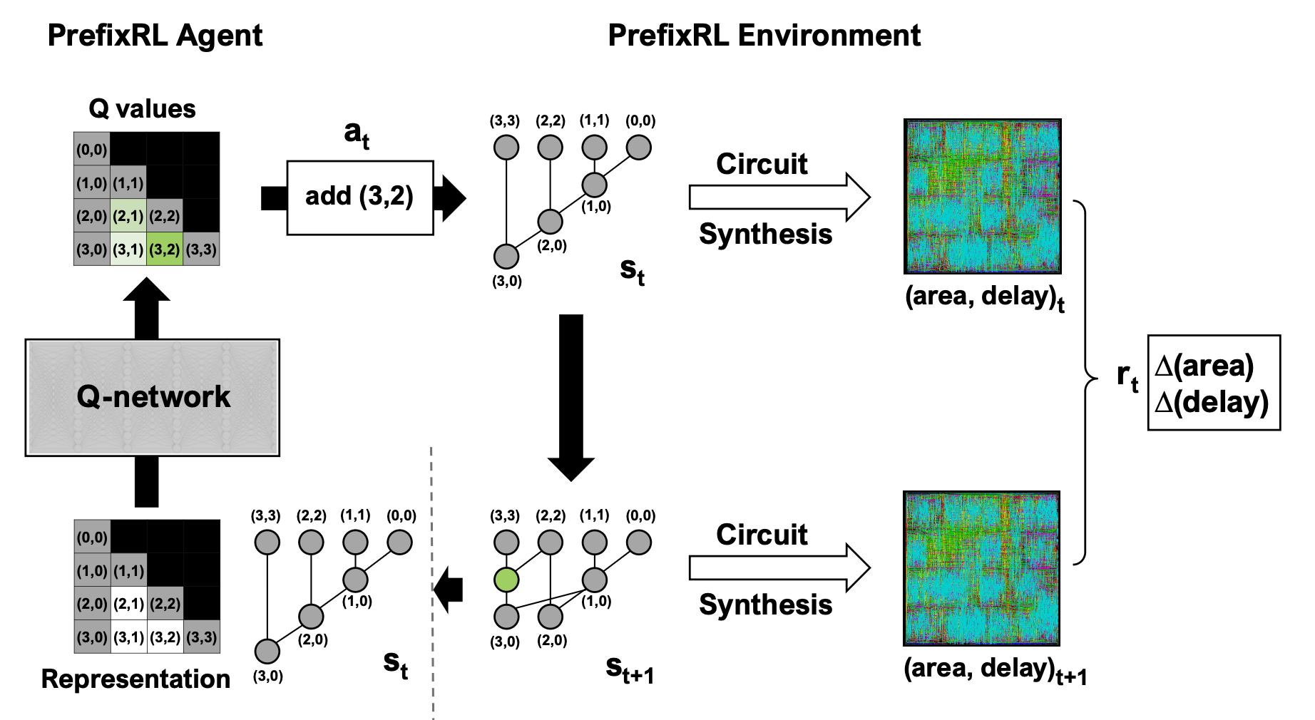 Roy et al. (2022) PrefixRL: Optimization of Parallel Prefix Circuits using Deep Reinforcement Learning. doi:10.1109/DAC18074.2021.9586094