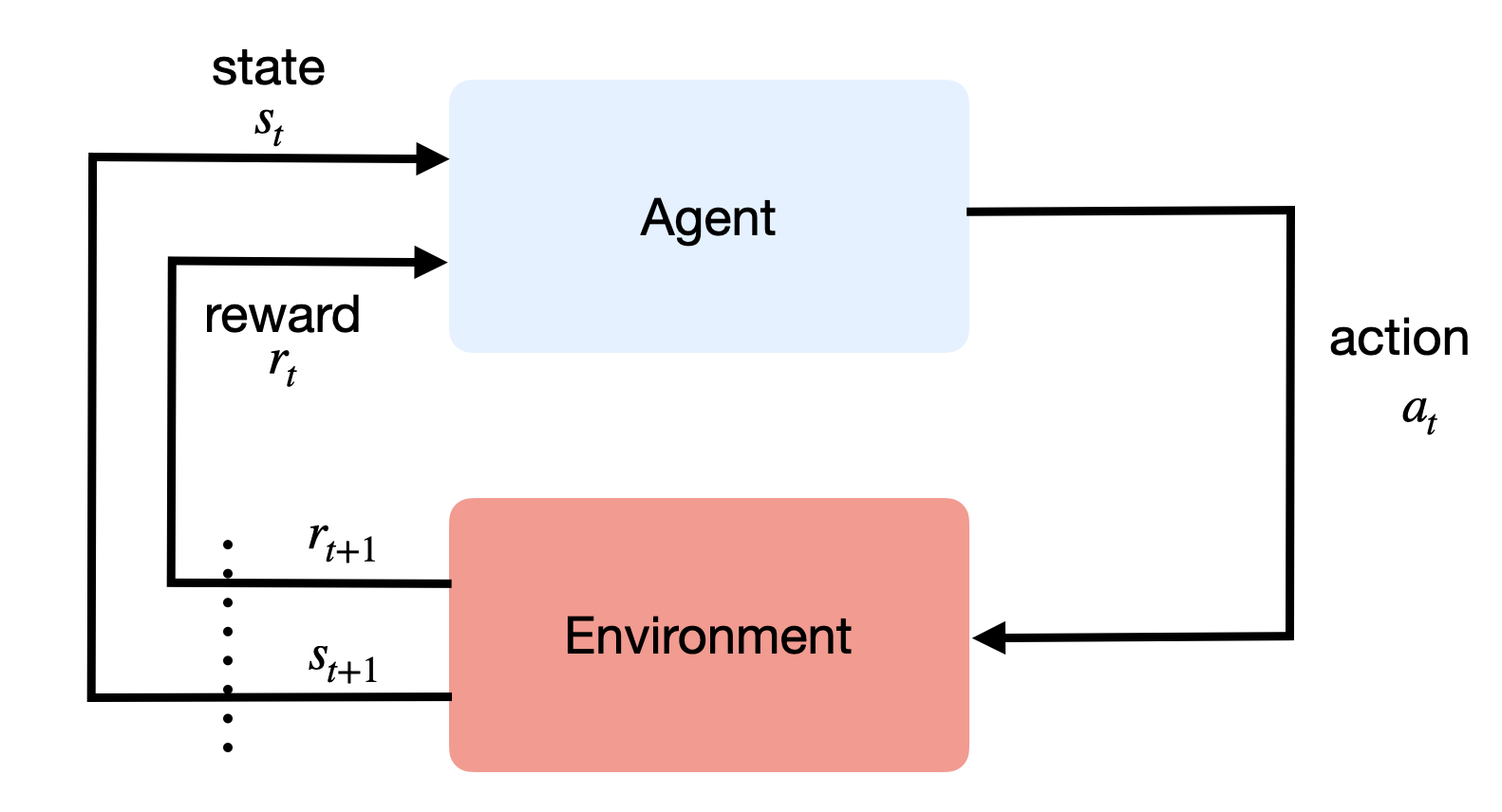 The agent and the environment interact at discrete time steps: t=0, 1, …