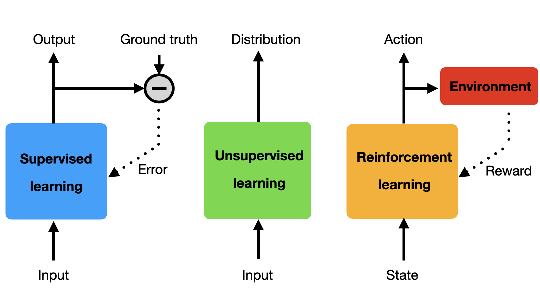 Supervised learning: the correct answer (ground truth) is provided to the algorithm, the prediction error drives learning directly.