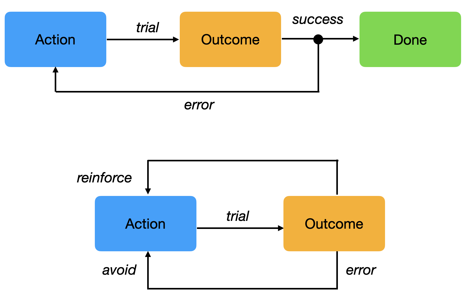 If the outcome is positive (reward), the action is reinforced (more likely to occur again).