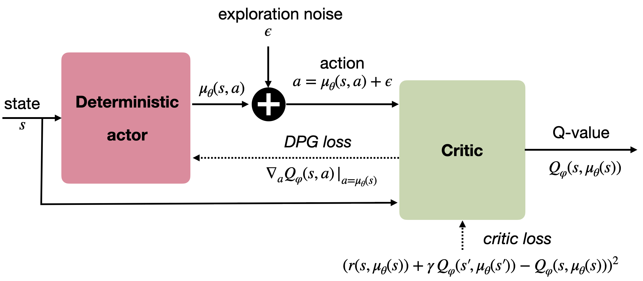 This does not work well with DDPG, as the Bellman target t = r + \gamma \, Q_{\varphi'}(s', \mu_{\theta'}(s')) uses a target actor network that is not very different from the trained deterministic actor.