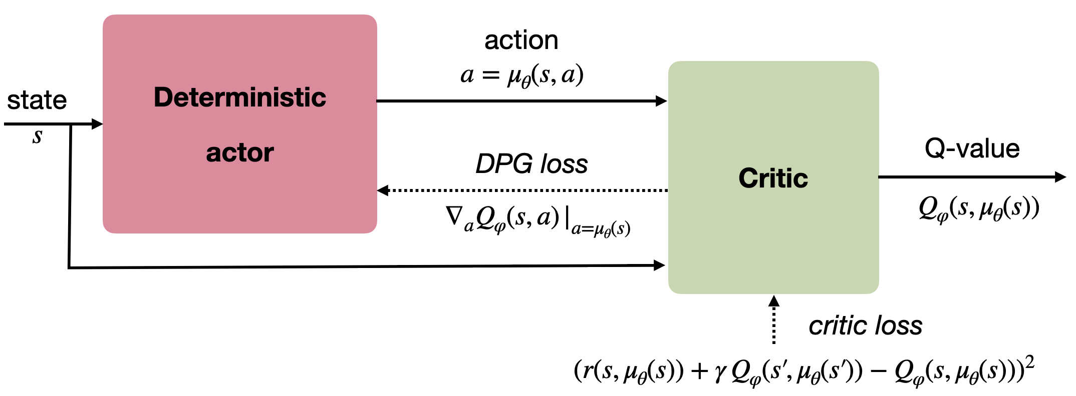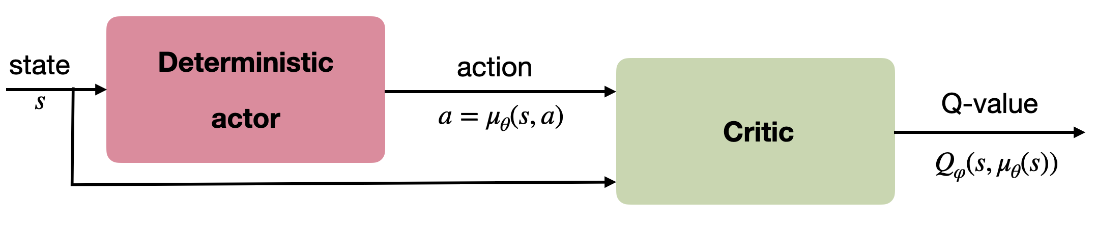 \nabla_\theta \mathcal{J}(\theta) = \mathbb{E}_{s \sim \rho_\theta}[\nabla_\theta \, \mu_\theta(s) \times \nabla_a Q_\varphi(s, a) |_{a = \mu_\theta(s)}]