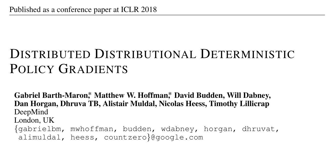 Barth-Maron et al. (2018) Distributed Distributional Deterministic Policy Gradients. arXiv:1804.08617.