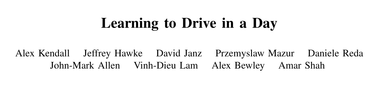 Kendall et al. (2018) Learning to Drive in a Day. arXiv:1807.00412