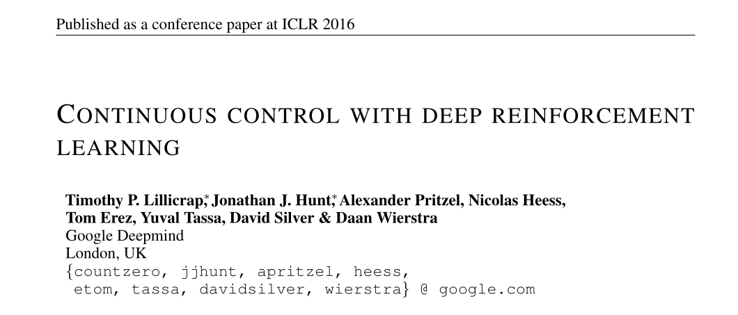 Lillicrap et al. (2015) Continuous control with deep reinforcement learning. CoRR. arXiv:1509.02971.