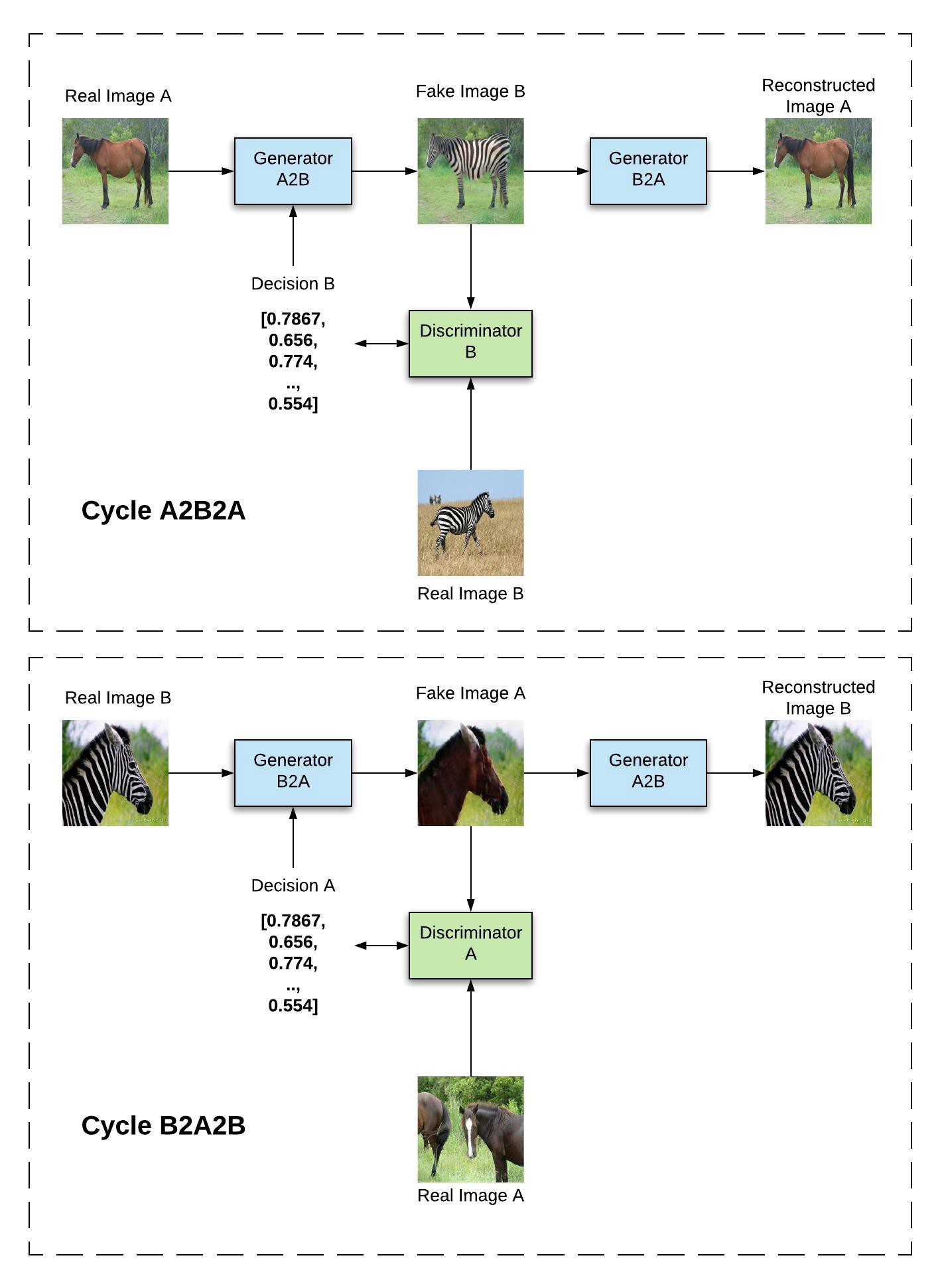In the B2A2B cycle, the domains are reversed, what allows to train the A discriminator.