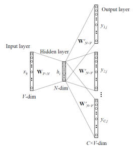 It uses a three-layer autoencoder-like NN, where the hidden layer (latent space) will learn to represent the one-hot encoded words in a dense manner.
