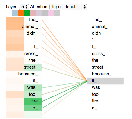 In the sentence The animal didn’t cross the street because it was too tired., the new representation for the word it will hopefully contain features of the word animal after training.