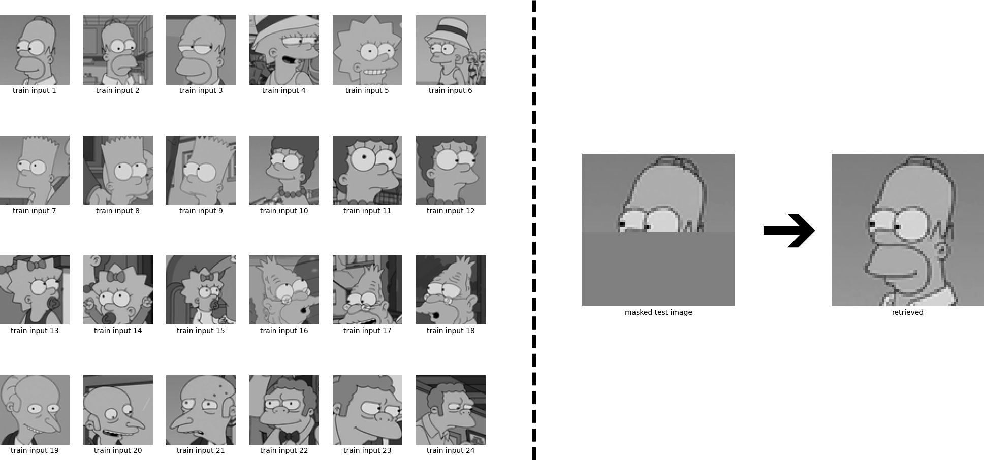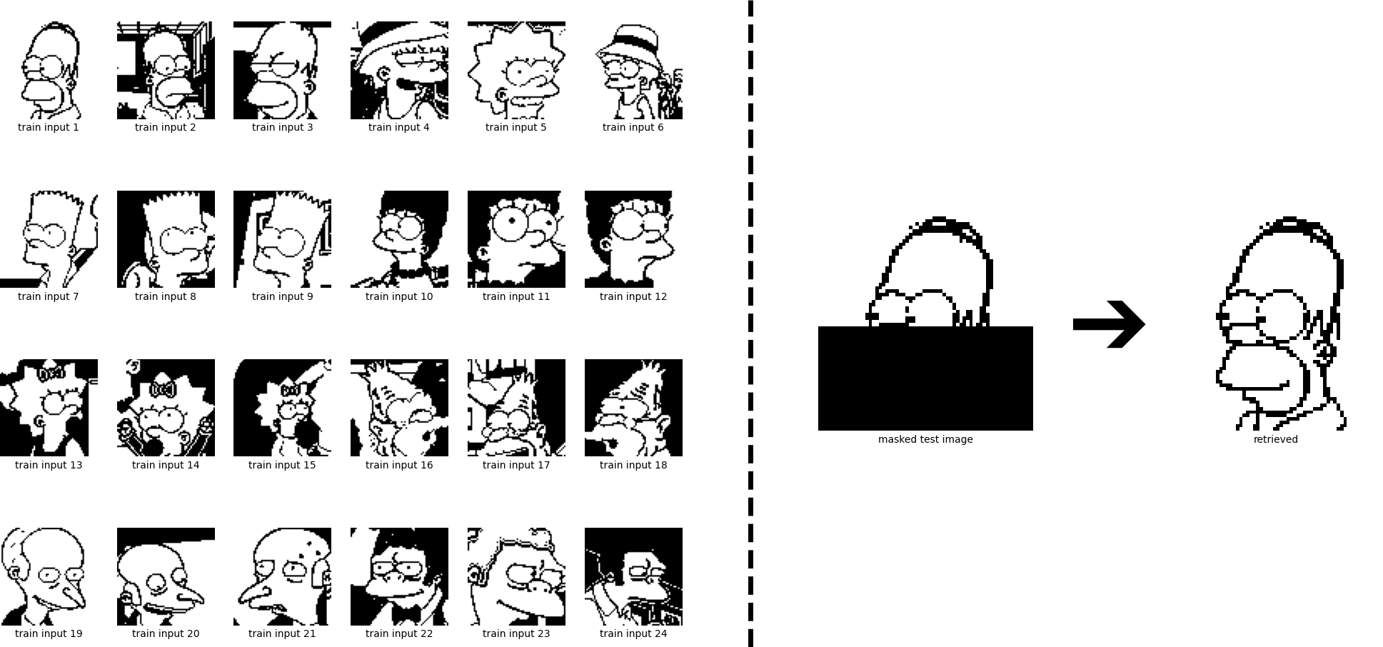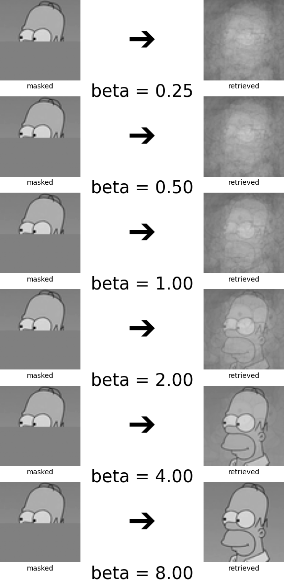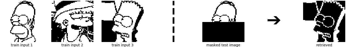 In this example, the masked Homer is closer to the Bart pattern in the energy function, so it converges to its ghost pattern.