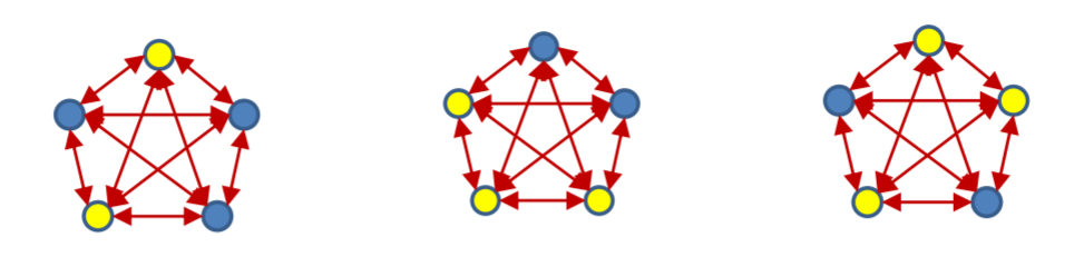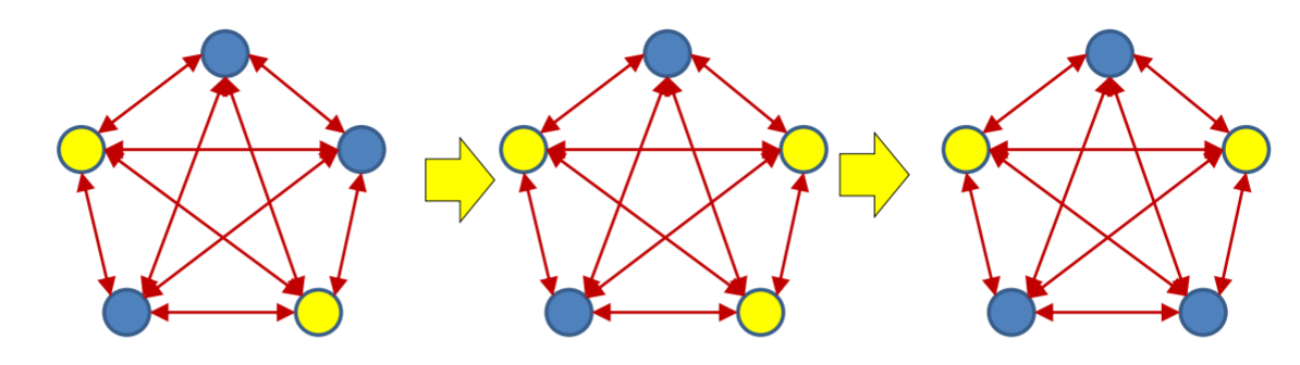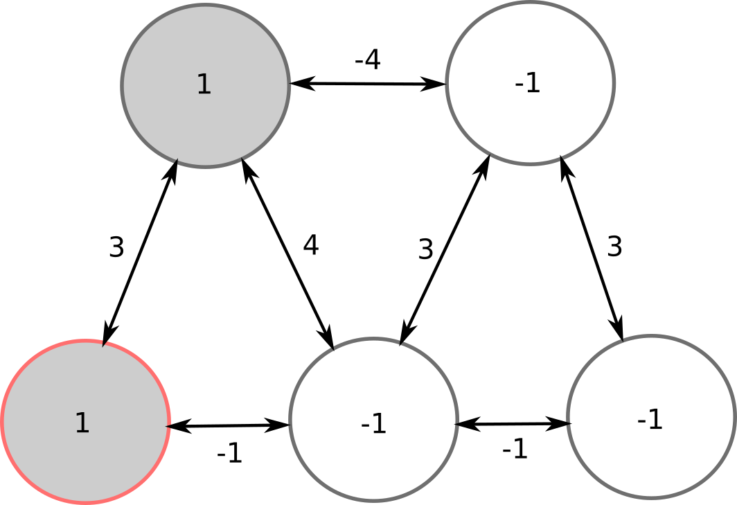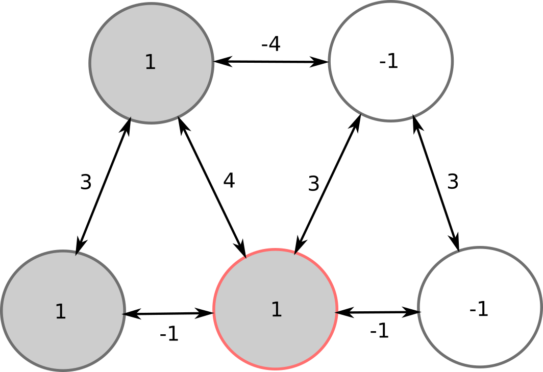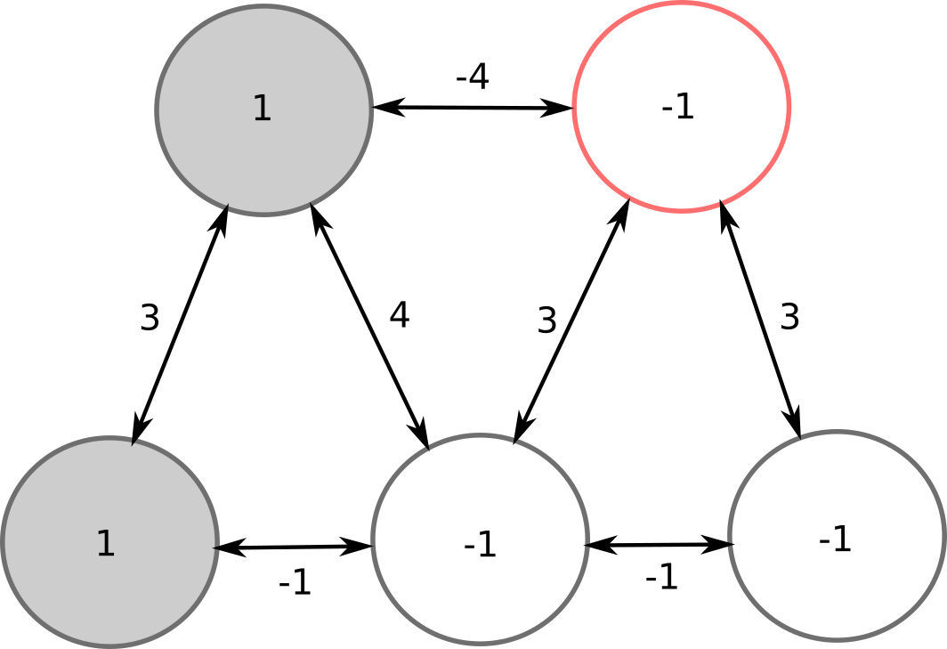 In the initial state, 2 neurons are on (+1), 3 are off (-1).