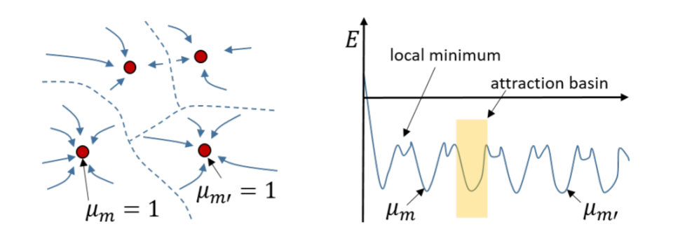 Other patterns have higher energies and are attracted by the closest stable pattern (attraction basin).