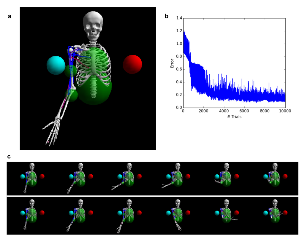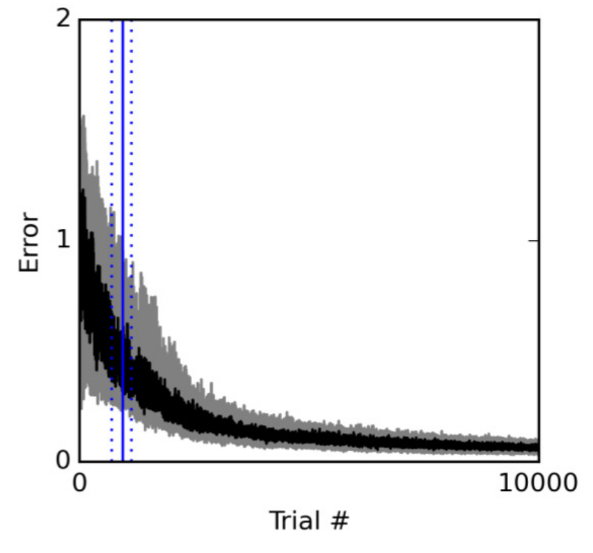 Learning is quite slow (ca 1000 trials), but only from sparse rewards at the end of the trial.