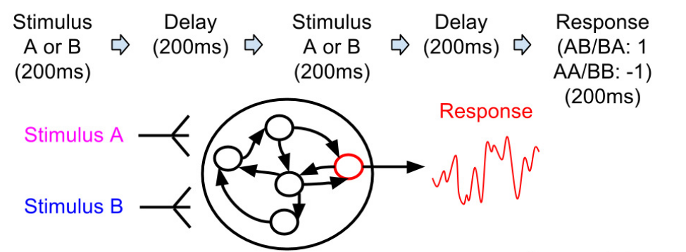 Given enough neurons in the reservoir and dynamics at the edge of the chaos, a RC network can approximate any non-linear function between an input signal \mathbf{I}(t) and a target signal \mathbf{t}(t).