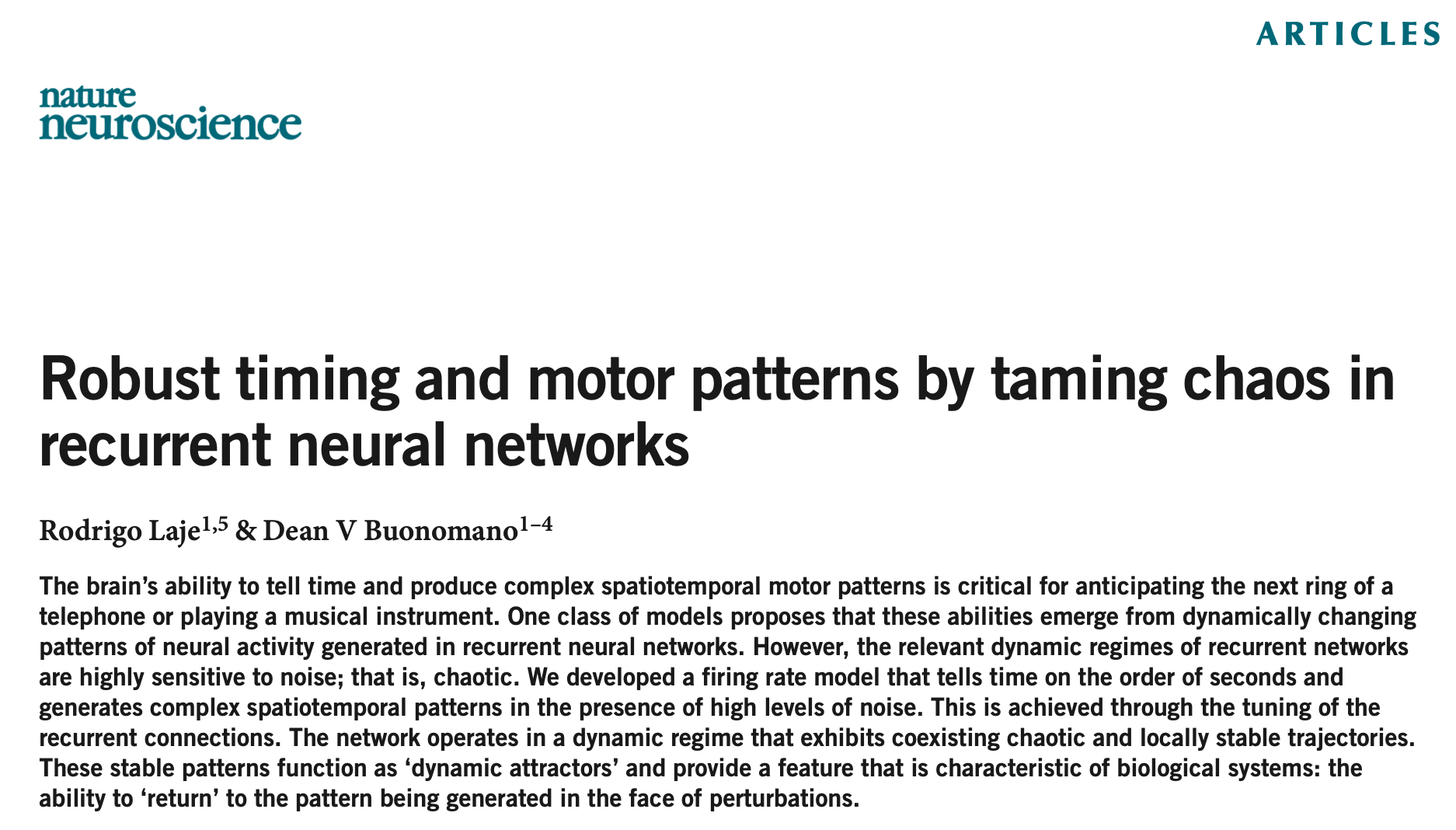 Laje and Buonomano (2013) Robust timing and motor patterns by taming chaos in recurrent neural networks. Nature Neuroscience, 16(7), 925–933.