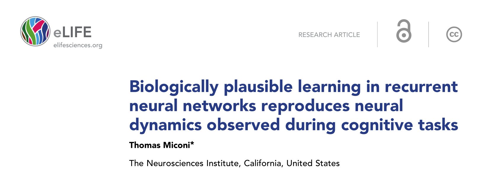 Miconi (2017) Biologically plausible learning in recurrent neural networks reproduces neural dynamics observed during cognitive tasks. eLife 6:e20899.