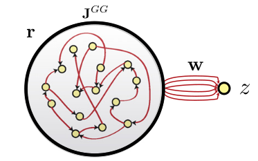 \begin{cases} \tau \, \dfrac{d \mathbf{x}(t)}{dt} + \mathbf{x}(t) = W^\text{IN} \times \mathbf{I}(t) + W^\text{REC} \times \mathbf{r}(t) + W^\text{FB} \times \mathbf{z}(t) \\ \\ \mathbf{r}(t) = \tanh \, \mathbf{x}(t) \\ \\ \mathbf{z}(t) = W^\text{OUT} \times \mathbf{r}(t) \\ \end{cases}