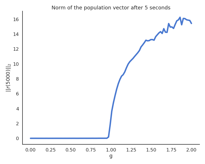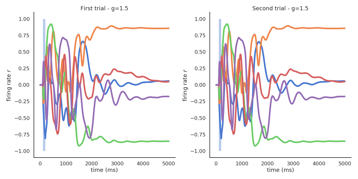 g=1.5 is the edge of chaos: the dynamics are very rich, but the network is not chaotic yet.