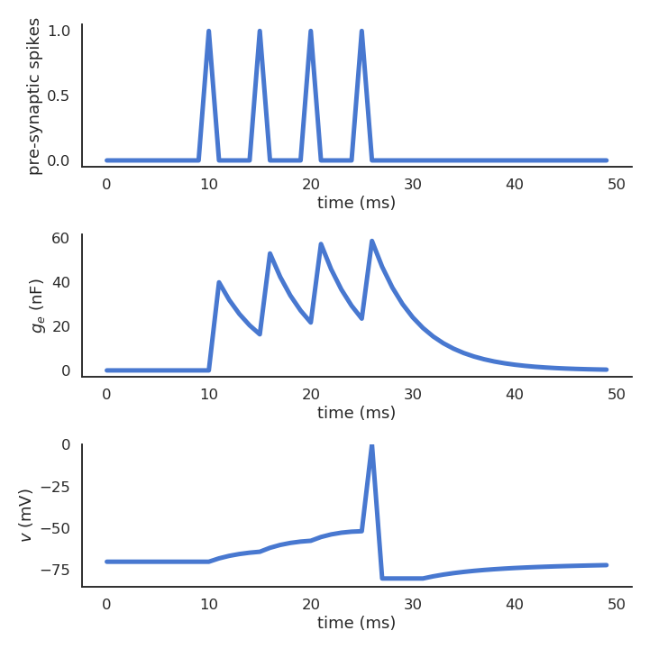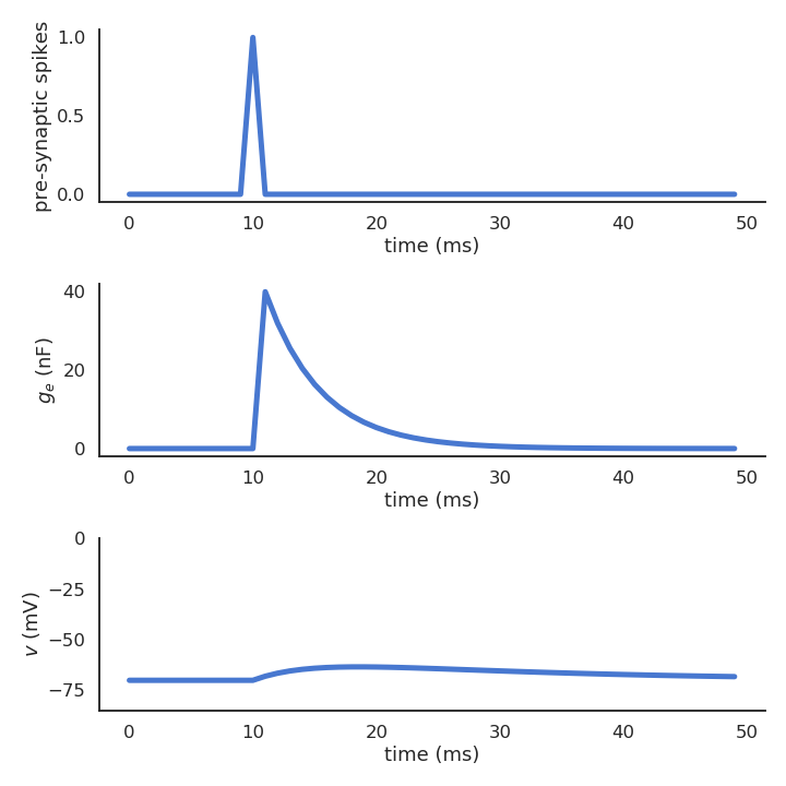 C \, \frac{dv(t)}{dt} = - g_L \, (v(t) - V_L) - g_e(t) \, (v(t) - V_E) + I(t)