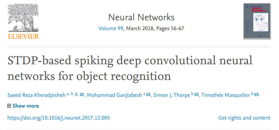 Kheradpisheh et al. (2018) STDP-based spiking deep convolutional neural networks for object recognition. Neural Networks 99, 56–67.