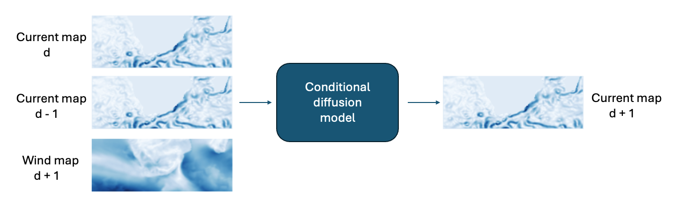 Accurate prediction of ocean surface currents is critical for oil spill response and maritime safety operations. Traditional oceanographic models often lack the spatial and temporal resolution needed for real-time emergency decision-making. We developed a conditional diffusion model approach that forecasts high-resolution ocean current maps by leveraging historical current data and wind forecasts. The model learns to predict the next day’s current patterns based on the previous two days of observations and forecasted wind conditions.