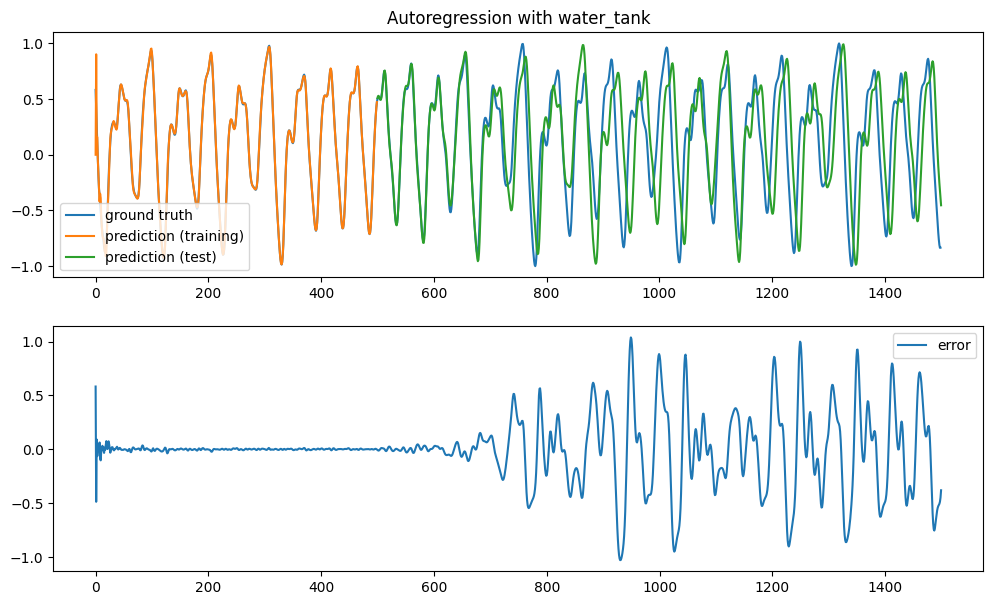 net = ESN(N, N_in, N_out, g, tau, sparseness)We train the reservoir for 500 time steps and let it predict the signal autoregressively for 1000 steps.